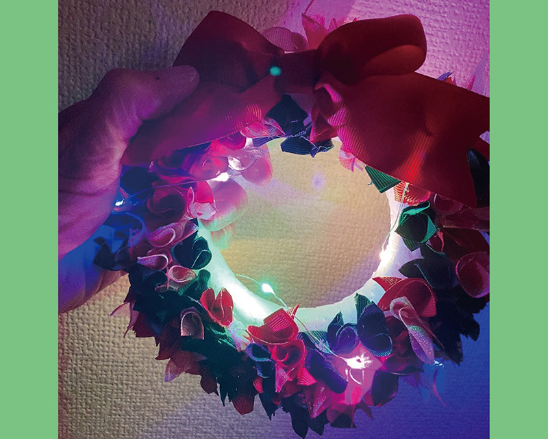 今年のリースはライトを巻きつけるのでピカピカ光ります。