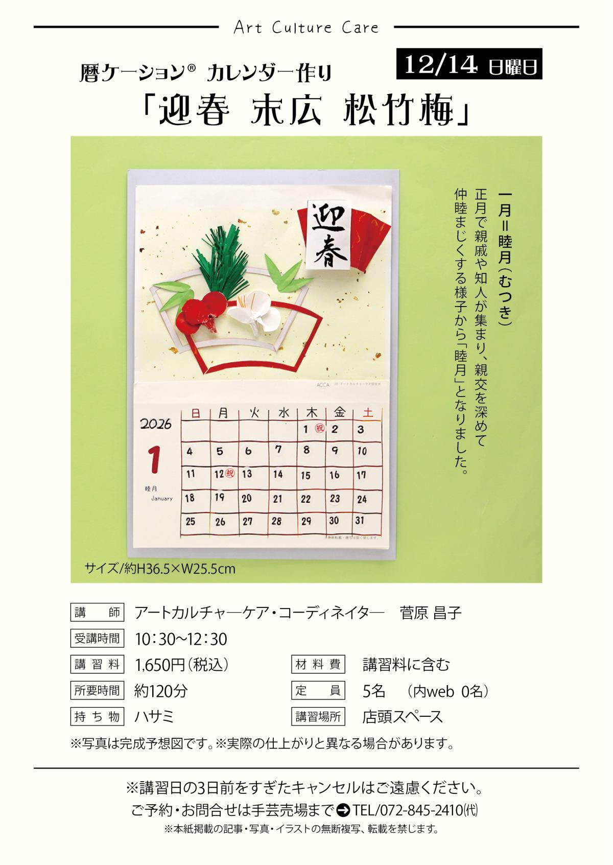 マルチクラフト講習暦ケーション® カレンダー作り 「迎春 末広 松竹梅」 ■受講料 1,650円(税込) ■講習時間 10:30~12:30 ■定員 5名(内web 0 名) ■サイズ 約H36.5×W25.5cm ■持ち物 ハサミ 【事前予約可】ワークショップ 事前にご予約いただけます。受講日当日にお席の空きがあれば受講いただけます。 講習開始時間までに必ずお越しください。