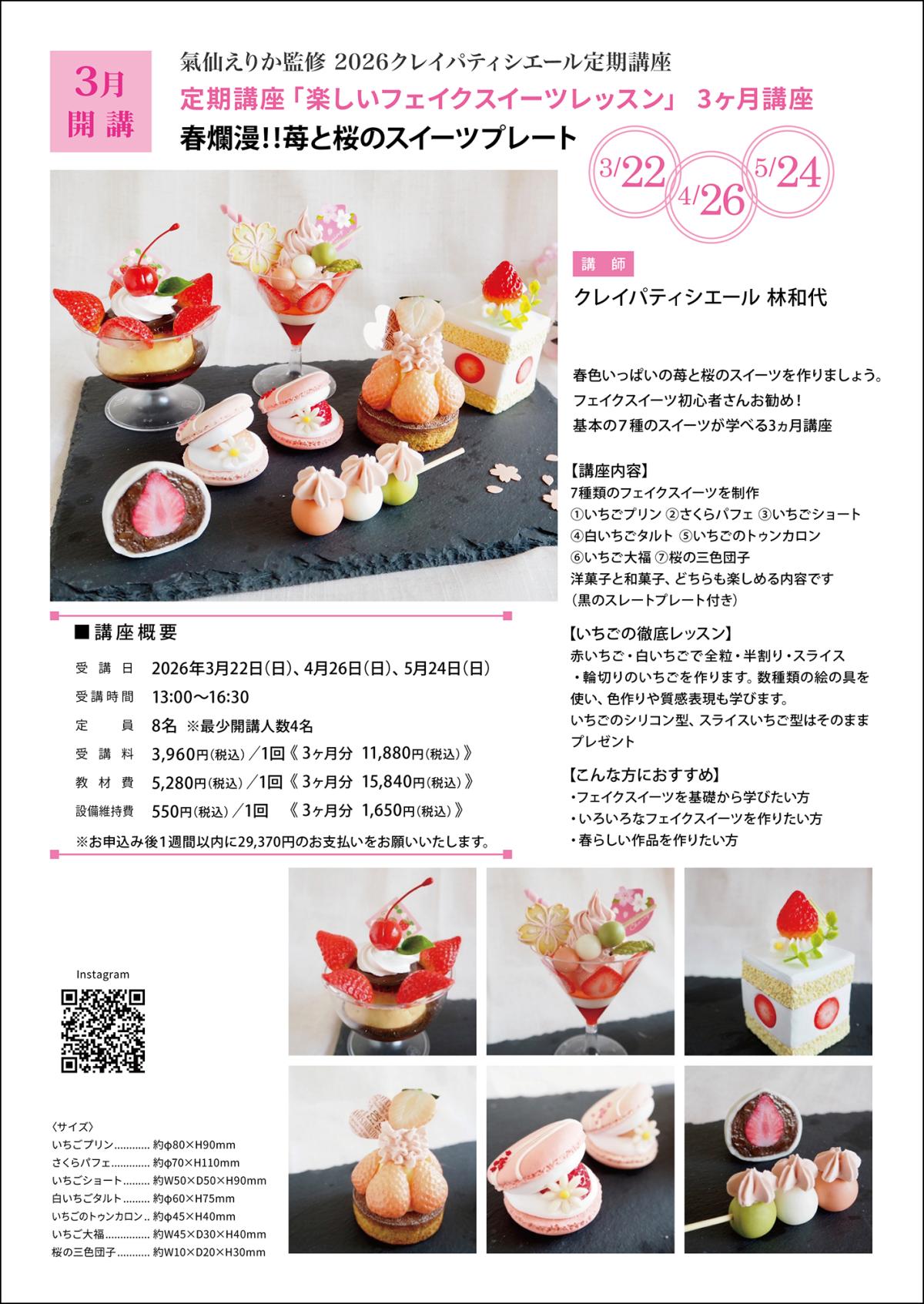 3ヶ月講座「春爛漫!!苺と桜のスイーツプレート」 春色いっぱいの苺と桜のスイーツを作りましょう。 フェイクスイーツ初心者さんお勧め! 基本の7種のスイーツが学べる3ヵ月講座 ワークショップのご予約を 2月14日(土)10:00~ WEB予約にて開始いたします。 講習会の内容はWEB予約開始と同時にホームページに掲載されます。 講習ページに掲載される予約ボタンからご予約をお進みください。 ※2名増席しました。 ABCクラフトあべのキューズモール店にて開催