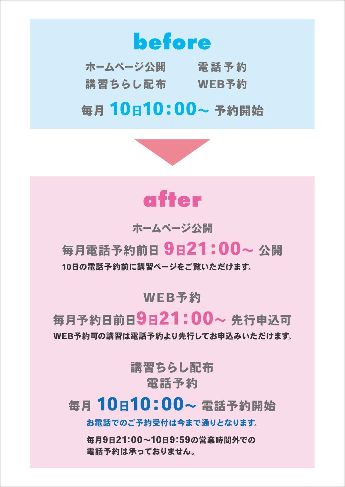 2026年1月10日予約開始から変更になります。毎月10日10時に講習会のホームページ公開・電話予約・WEB予約・講習ちらし配布を していますが、2026年2月講習会のお申込みより変更いたしますのでご案内いたします。 変更は2026年1月10日予約開始から下記の通りとなります。