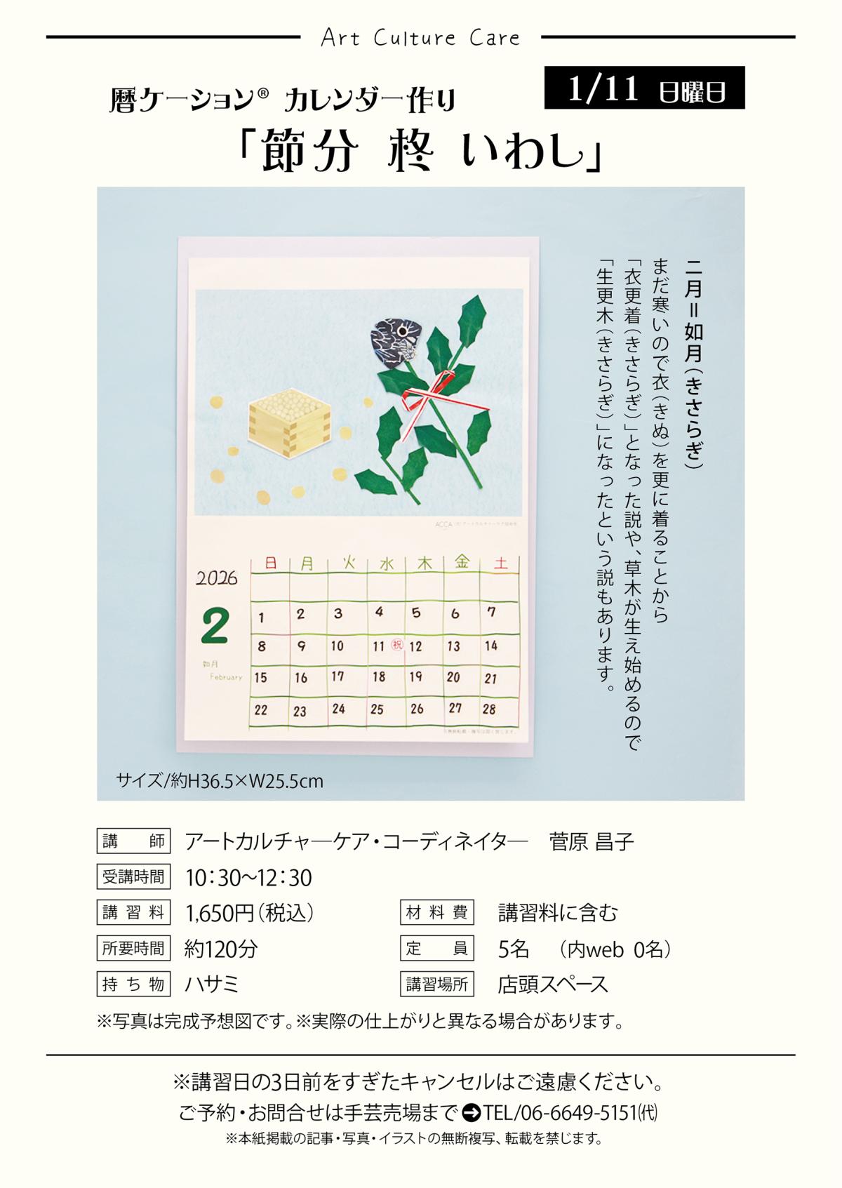 マルチクラフト講習暦ケーション® カレンダー作り 「節分 柊 いわし」 ■受講料 1,650円(税込) ■講習時間 10:30~12:30 ■定員 5名(内web 0 名) ■サイズ 約H36.5×W25.5cm ■持ち物 ハサミ 【事前予約可】ワークショップ 事前にご予約いただけます。受講日当日にお席の空きがあれば受講いただけます。 講習開始時間までに必ずお越しください。