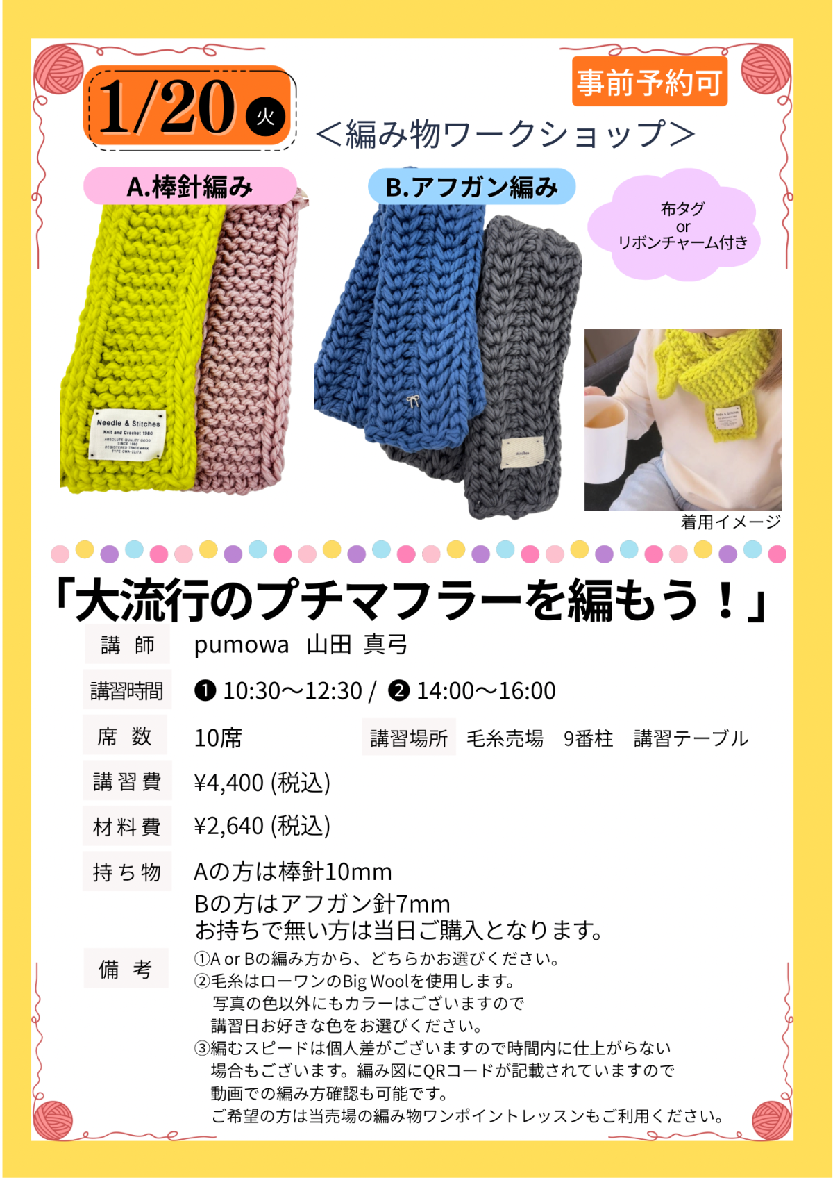 毛糸売場より編み物講習会のお知らせです! 2026年1月20日(火) 9番柱毛糸売場にて編み物の講習会を開催します! 海外でも注目のプチマフラーを編んでみませんか? 編み方は「棒針編み」又は「アフガン編み」のどちらかで作成となります。 仕上げにつけるパーツは「布タグ」又は「リボンチャーム」が選べます! 皆様のご参加お待ちしております! *ご予約はお電話にて承っております。