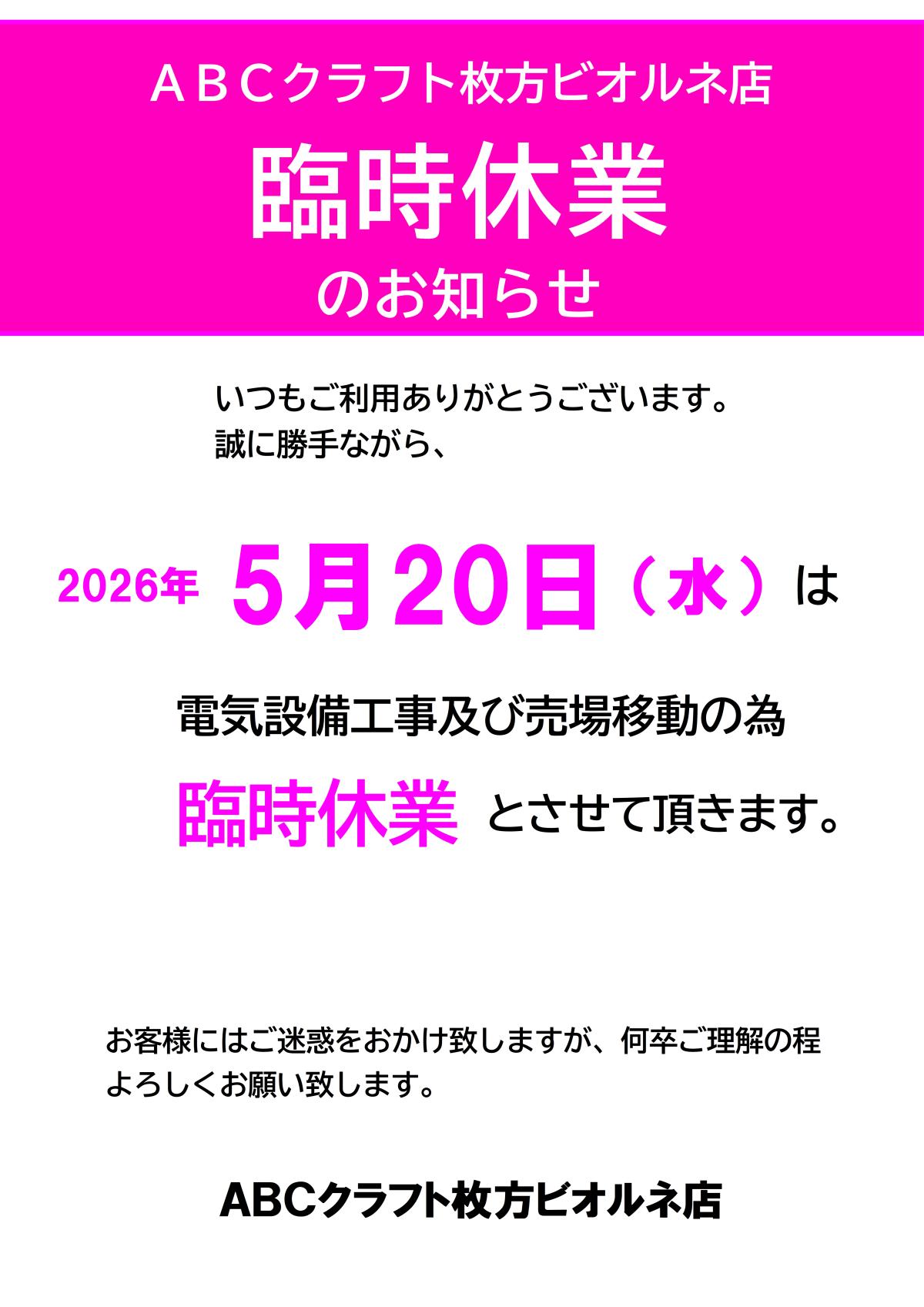 臨時休業のお知らせ【枚方ビオルネ店】